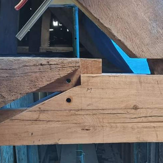 "An interesting detail, the tie beam scarf repair has dovetailed tenons to help take tension in the tie beam.The tie beam repair then dog legs and reduces in section size to form a new section of wallplate.